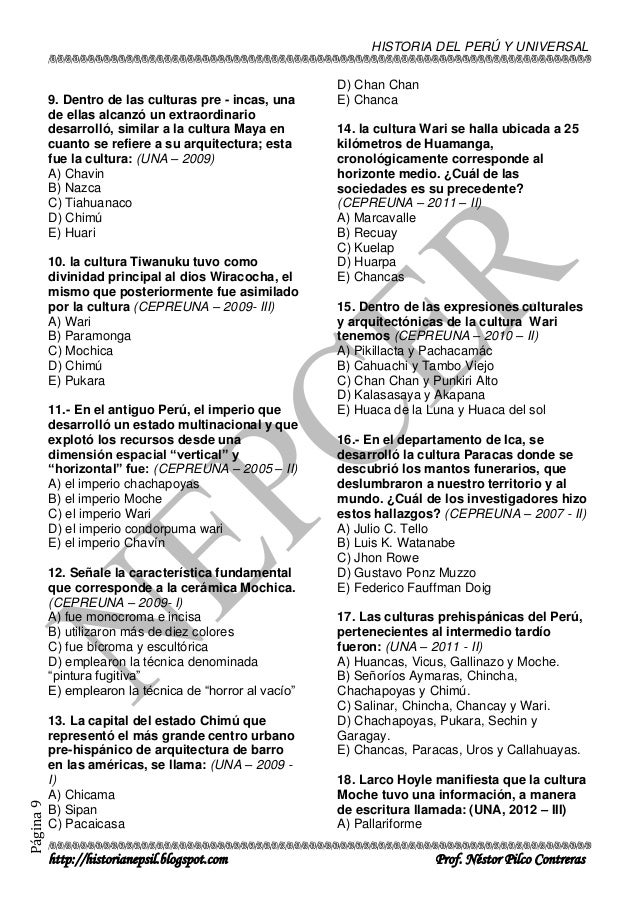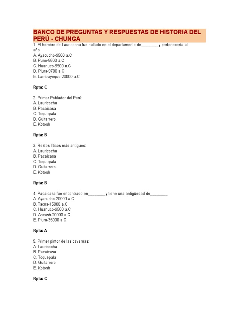 Preguntas Y Respuestas De Historia Del Peru. Lista de preguntas de perú; El hombre de lauricocha fue hallado 74.
