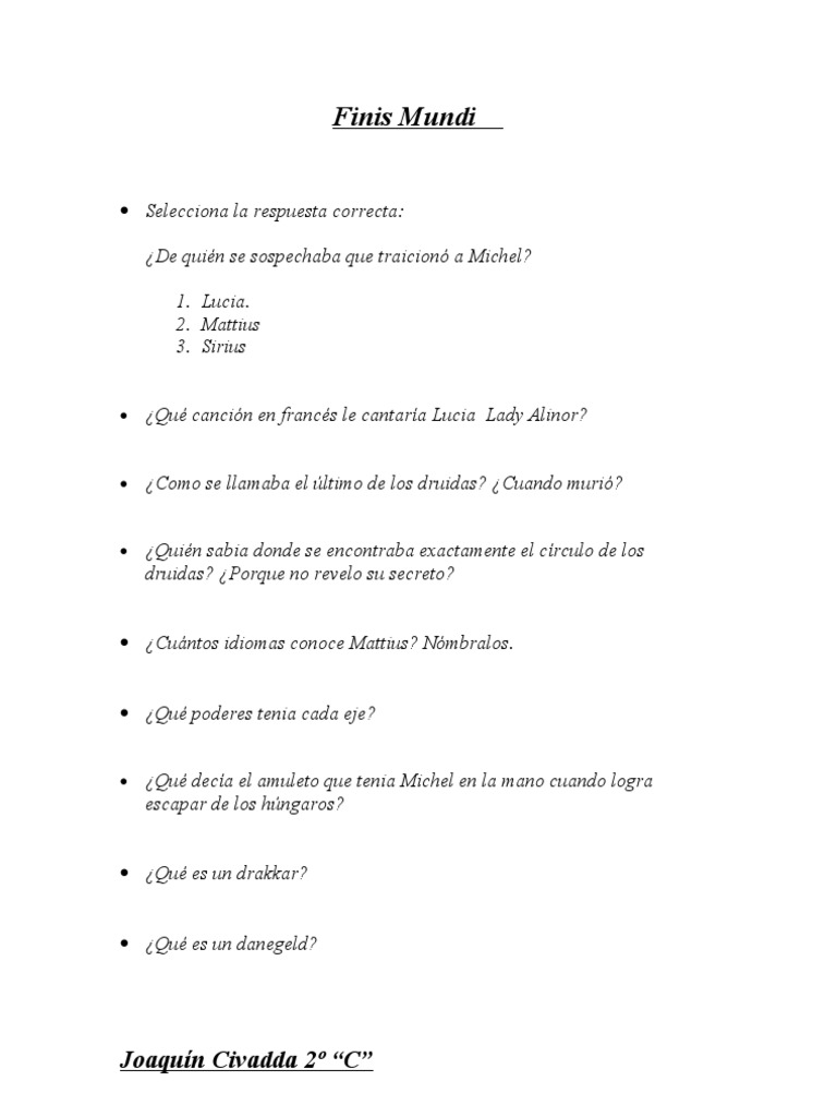 Finis Mundi Preguntas Y Respuestas. El libro finis mundi me ha parecido una obra bastante buena y una historia muy interesante porque adentrarse en tantos riesgos para conseguir un solo objetivo me fascina. Escrito el 22 de mayo de 2008 en español con un tamaño de 6,35 kb.