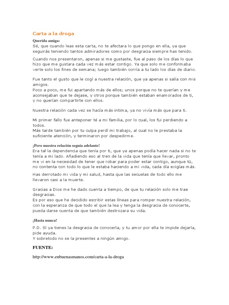 Ver modelo carta en formato pdf. Carta de un Drogadicto. Carta para un amigo que se va.